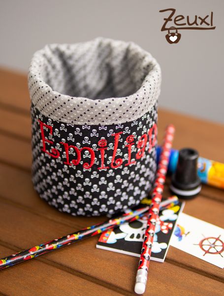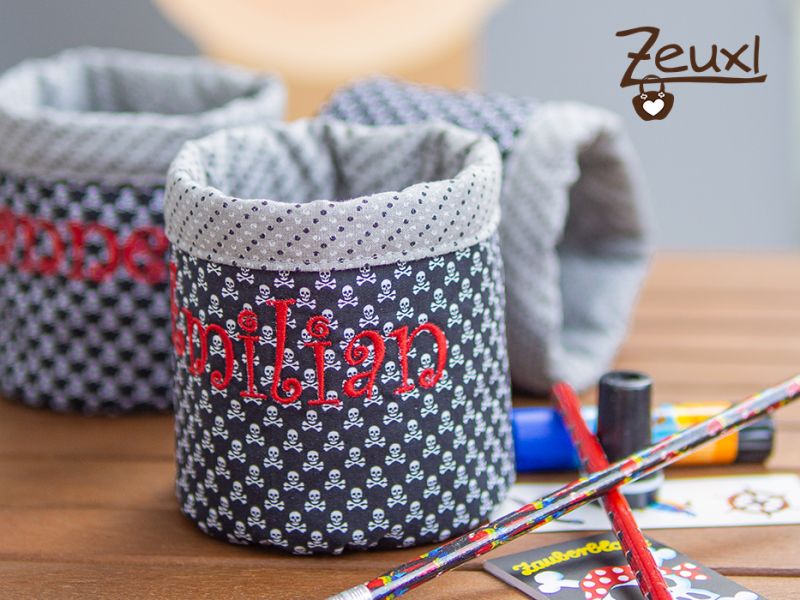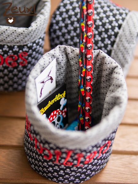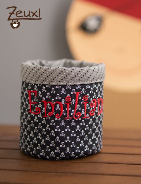 Der Schnitt dafür ist der Tondi Schnitt von Funkelrosa. Das Utensilo gibt es in verschiedene Größen und ist sogar ein Freebook. Ich entschied mich für die kleinste Größe. Für Außen besorgte ich dafür einen priatentauglichen Stoff und einen grau gepunkteten Stoff für Innen. Dann bestickte ich jedes Utensilo mit Namen des Kindes. So erhielt jeder Junge seinen persönlichen Schatz.