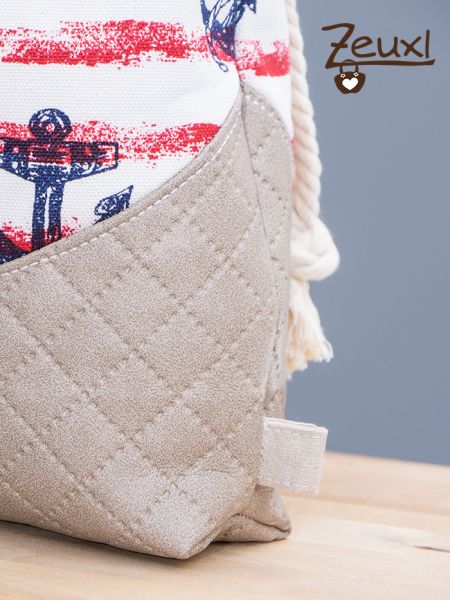 Außen verwendete ich Reststücke. Das gesteppte Kunstleder habe ich schon hier und hier für Taschen verwendet und ebenso den Canvas, siehe hier. Innen vernähte ich beschichtete Baumwolle, so können die nassen Sachen gut eingepackt nach Hause zum Waschen und Trocknen mitgenommen werden ohne dass die Feuchtigkeit durch die Tasche geht und alles andere nass macht.