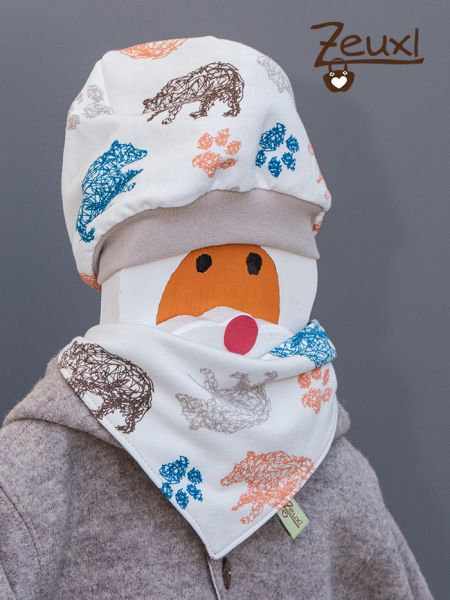 Damit der kleine Mann gut gerüstet ist nähte ich aus dem Bärenstoff noch eine Wintermütz von Annas Country und dazu ein Halstuch aus einem der Klimperklein Bücher.