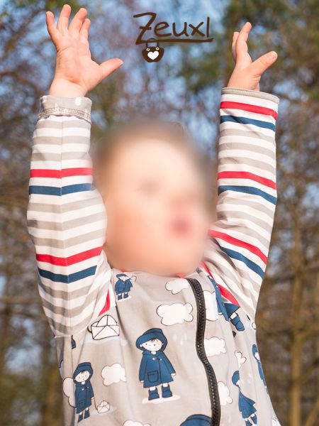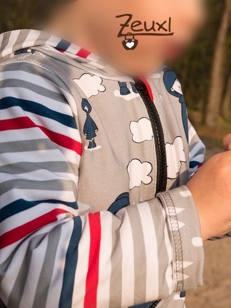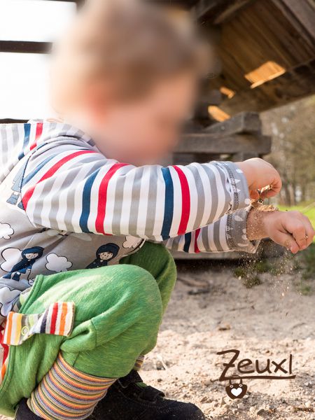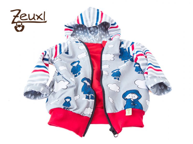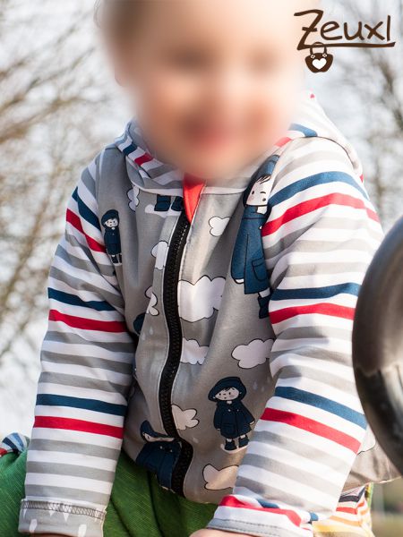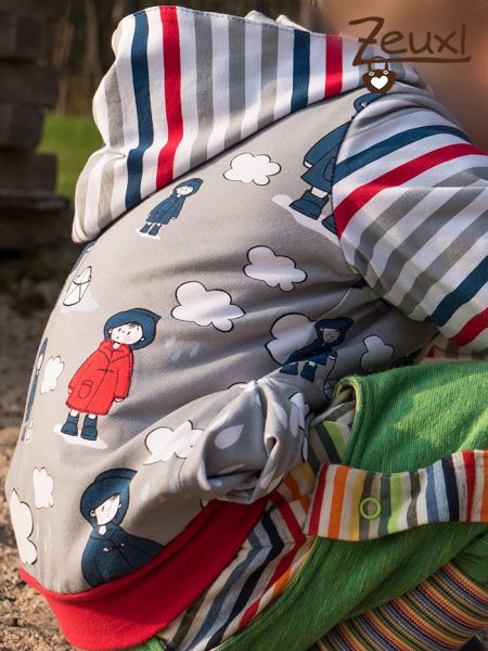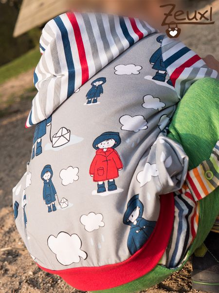 Manchmal ist es wirklich praktisch wenn die Stoffproduzenten gleich passende Kombistoffe zum Hauptstoff anbieten. Bei diesem Regenjungen mit seinem Bötchen war das der Fall und ich hab den Streifen- sowie den Tropfenstoff gleich mitbestellt. So konnte ich die Jacke mixen und alles passt super zusammen.