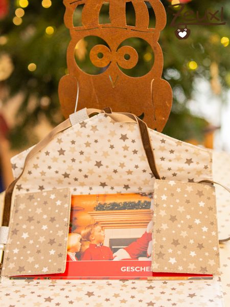 Ich wählte zwei weihnachtliche Stoffe mit Sternenmuster. Außen der etwas dunklere und innen der hellere Stoff. Gut gefällt mir, dass der Umschlag nicht mit einem Knopf oder ähnlichen verschlossen wird, sondern ein Band locker um den Umschlag gewickelt wird.