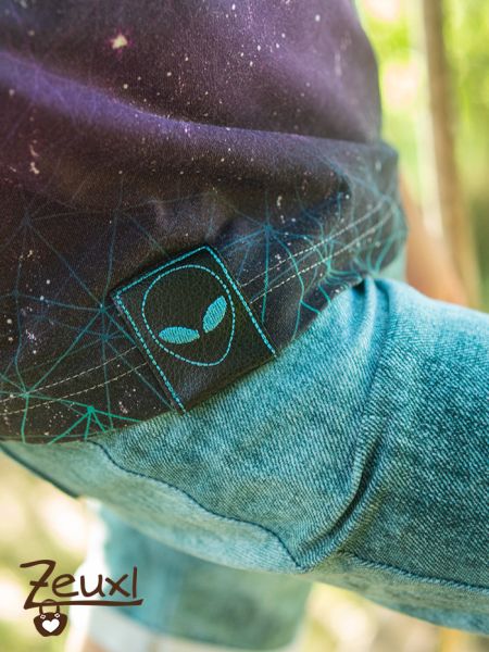 Zudem fertigte ich mit der Stickeinheit meiner Bernina ein passendes Label an. Die Datei ist mal wieder ;-) von Fadenspiel – Stick- und Plotterdateien mit Herz. Der Alienkopf in türkis auf schwarzen Kunstleder passt perfekt zum Stoff.