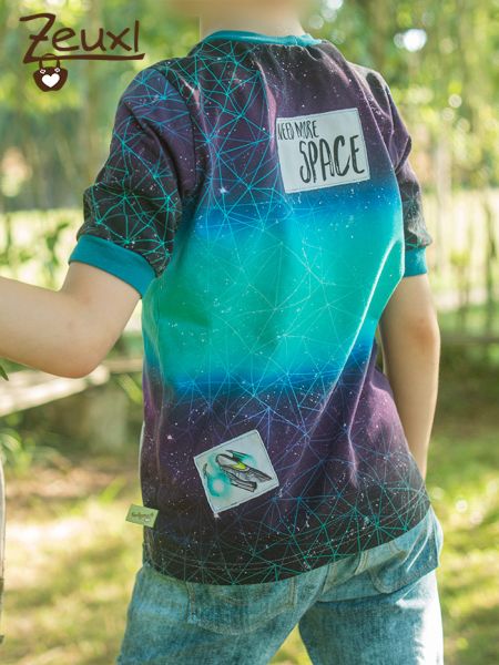 Der Farbverlauf auf diesem Weltraumjersey-Panel von der Fuchsfamilie ist ja mal mega, oder? Da braucht es keinen extravaganten Schnitt, damit der Stoff wirkt. Der Schnitt des Basic Shirts von Klimperklein kann je nach Stoff ganz unterschiedlich wirken und ist dadurch alles andere als langweilig und perfekt für solche Stoffe geeignet.