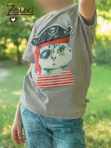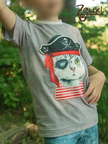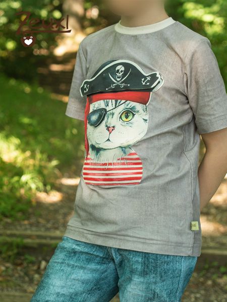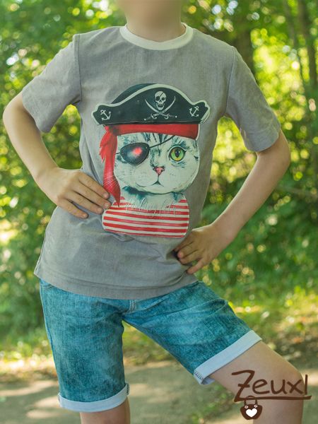 Das zweite Shirt ist aus einem Jersey in Jeansoptik und farblich sehr unspektakulär. Dafür macht der Piraten-Kater-Aufnäher dieses Shirt zu etwas ganz besonderem.