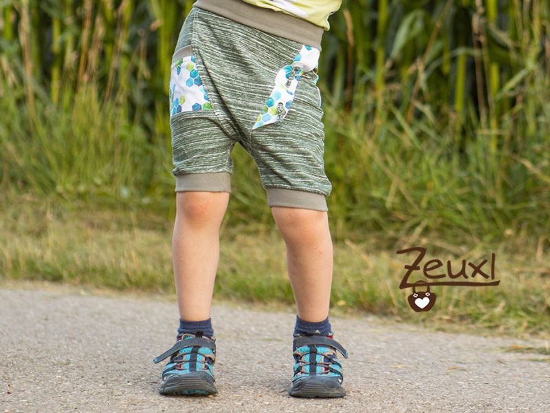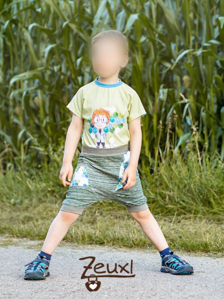 Die Hose kommt beim Buben schon deswegen gut an, weil die Quaffel Hosentaschen hat. Er liebt Taschen an der Kleidung nach wie vor, auch wenn mir nicht klar ist warum. Schließlich nutzt er sie so gut wie nie. Bei dieser kurzen Quaffel verzichtete ich auf die Tasche hinten.