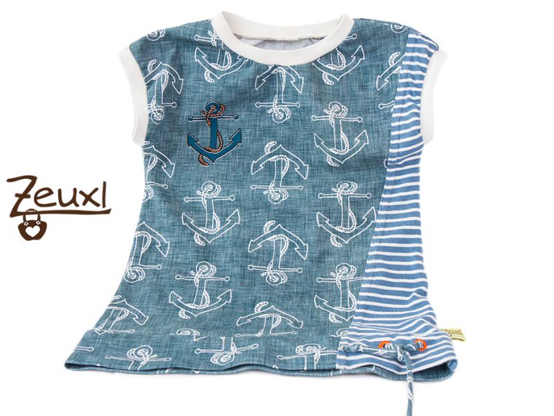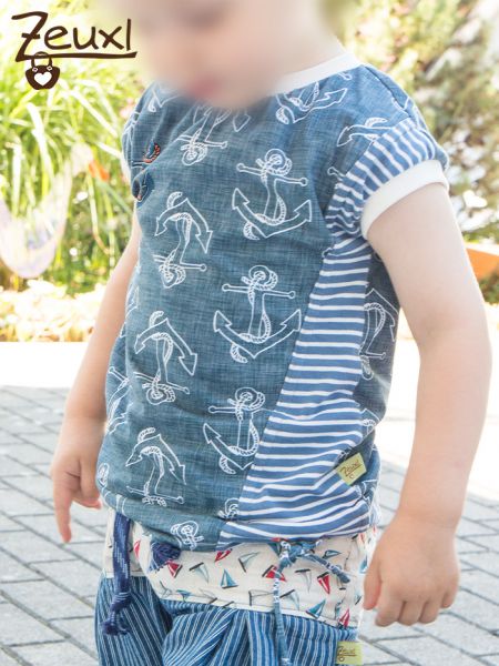 Nachdem ich für die heißen Tage schon dieses ärmellose Shirt für den Buben genäht hatte wollte ich auch den Tilt-Shirt-Schnitt testen. Die Besonderheit dieses Oberteils ist die schräge Teilung auf einer Seite und die Kordel am Saum.