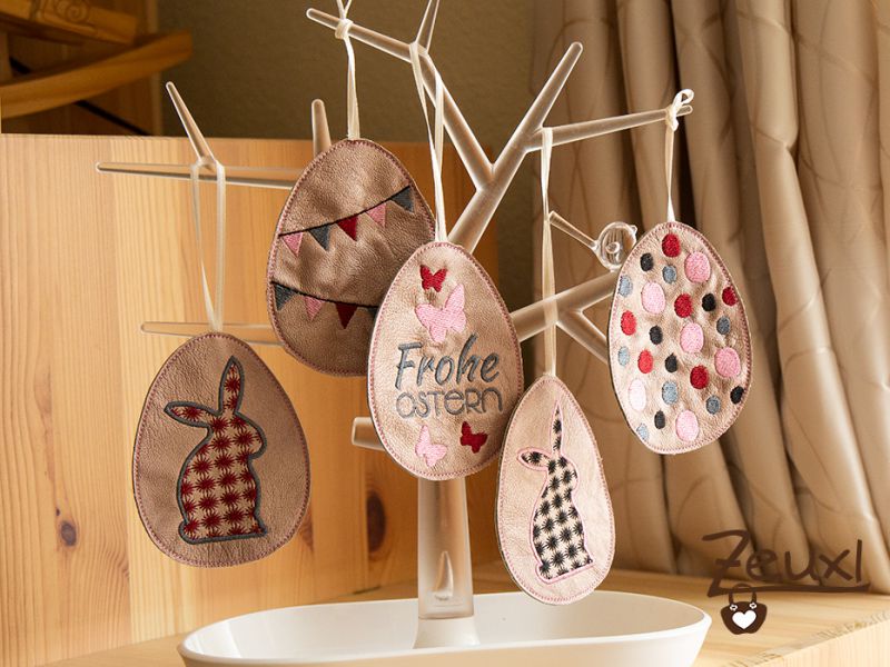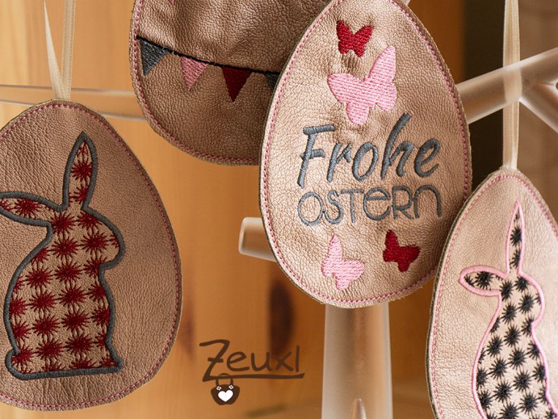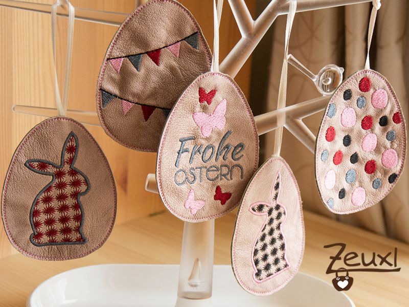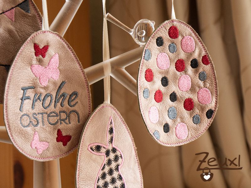 Für beides verwendete ich ITH-Stickdateien von FadenSpiel Handmade by NB. Es handelt sich zum einen um wunderschöne Ostereier, mit denen beispielsweise Osterstrauß, Türkranz oder Fenster dekoriert werden können. Dafür verwendete ich ein rosafarbenes, metallisch schimmerndes Kunstleder.