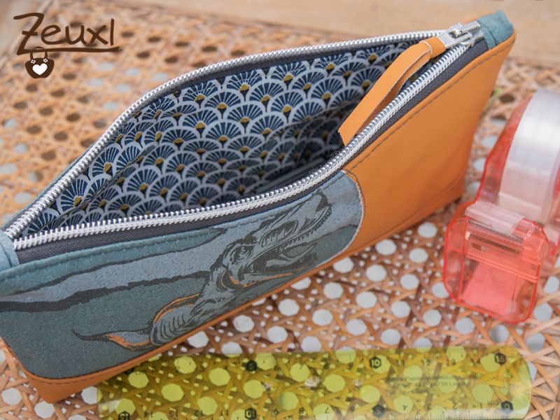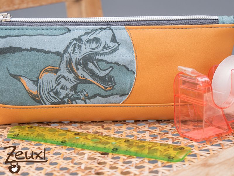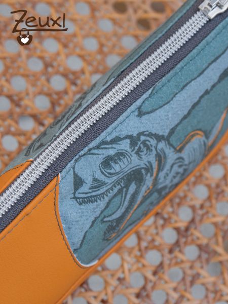 Zum T-Rex kombinierte ich meinen letzten Schnipsel vom tollen, curryfarbenen Kunstleder, das ich schon für mehrere Taschen (hier und hier) verwendete. Dazu noch einen grauen Reißverschluss und einen beschichteten Baumwollstoff für innen. So kann das Mäppchen auch mal feucht ausgewischt werden.
