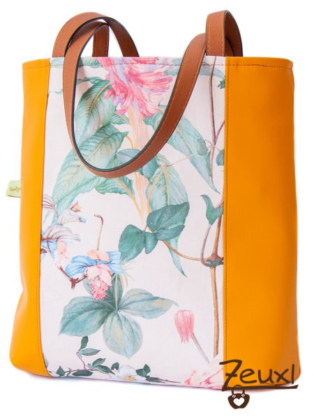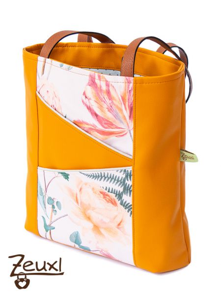 Bei Myo Stoffe bin ich auf diesen schönen Blumenstoff gestoßen und habe zugegriffen. Ich musste meinen ganzen Mut zusammen nehmen, um ihn mit dem curryfarbenen Kunstleder zu kombinieren. Curry, oder Senf finde ich als Farbe einfach toll und wie gesagt, kann ich mich für Pastell Töne nicht so wirklich begeistern. Vorweg war ich mir einfach nicht sicher, ob das zusammen harmoniert. Was bin ich froh, dieses Experiment eingegangen zu sein. Schon während des Nähens sind diese Bedenken schnell verflogen. Für mich passt das farblich super zusammen. Aber über Geschmack lässt es sich ja bekanntlich streiten…