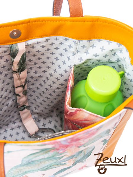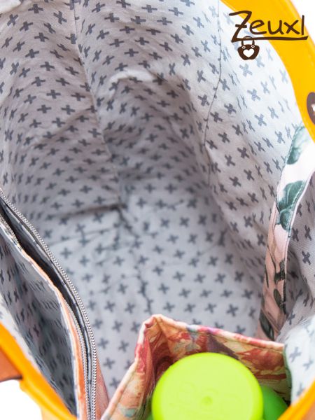 Bei dieser Blumen Taniia verwendete ich alle Innenoptionen. Den Getränkehalter kann ich gut mit kleineren Flaschen verwenden. Sogar in verkleinerter Größe ist das Reißverschlussfach und das Steckfach innen noch gut zu verwenden. Zudem stattete ich diese Taniia noch mit einem Schlüsselfinder aus.