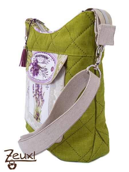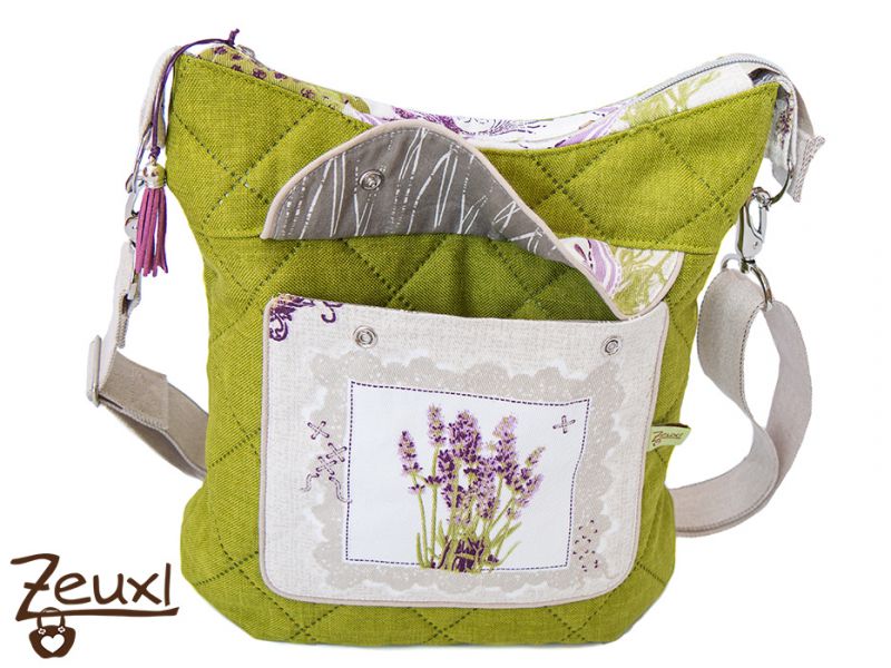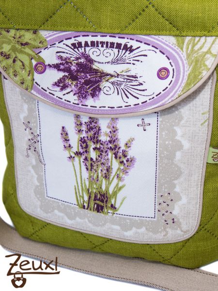 Der grüne Taschenstoff passt prima zu den Motiven und Farben des „Lavendel-Canvas“, den ich mal auf einem Stoffmarkt erstanden hatte. Im E-Book ist vorgesehen, dass die Aufsatztasche vorne eine hübsche Kellerfalte hat. Damit mein Lavendelmotiv gut zur Geltung kommt, habe ich diese allerdings bewusst weggelassen. Unikati erklärt im E-Book sehr ausführlich wie die Aufsatztasche mit einer Paspel verschönert werden kann. Außerdem stehen zwei Klappenformen zur Wahl. Mir gefällt die abgerundete Form besser als die spitz zulaufende, aber das ist natürlich reine Geschmackfrage.