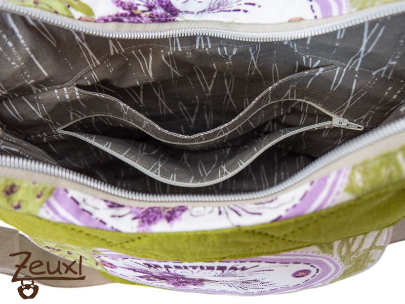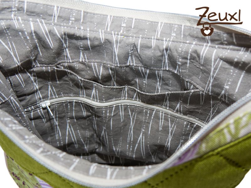 Innen verwendete ich einen gemusterten Baumwollstoff, der die besondere Innentasche leider nicht so gut erkennen lässt. Denn das Besondere daran ist, dass es ein Reißverschlussfach und dahinter eine Einstecktasche gibt. Ich mag das ja sehr gerne, wenn Kleinigkeiten wie Taschentücher, Schlüssel oder auch das Handy einen festen Platz in der Tasche haben und ich nicht immer den ganzen Inhalt durchwühlen brauche.