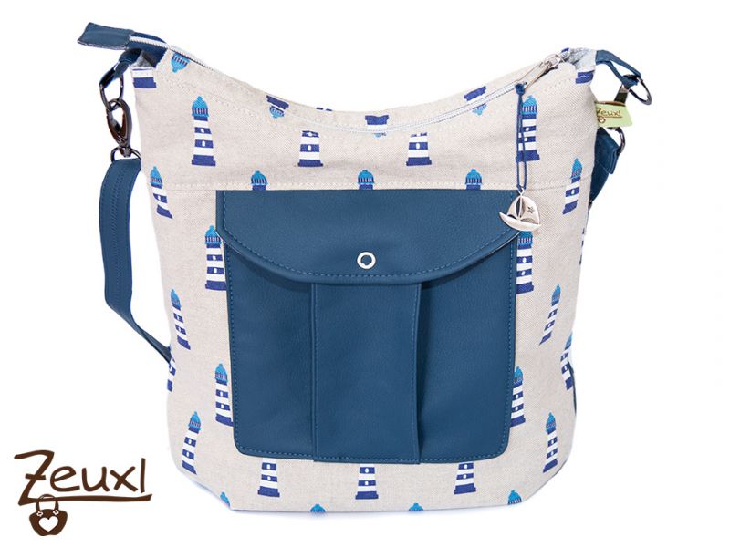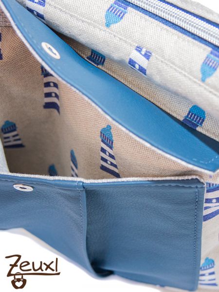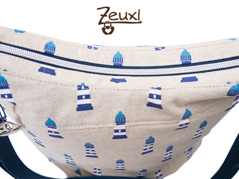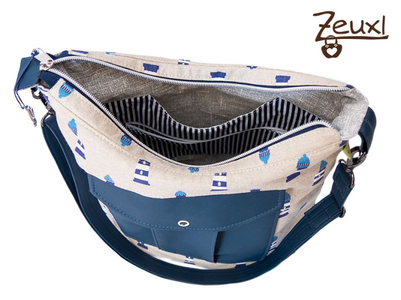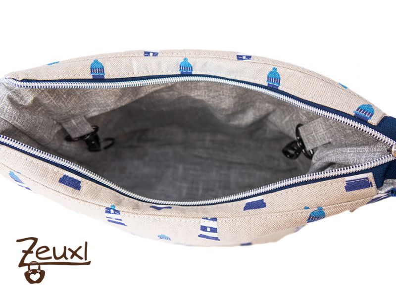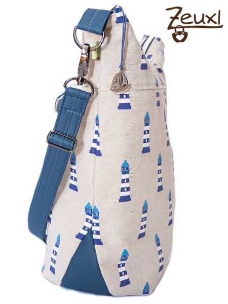 Ich finde der etwas grobere Canvas mit den Leuchttürmen passt recht gut zum dunkelblauen Kunstleder. Der verstellbare Tragegurt ist ebenfalls aus dem Kunstleder gefertigt. Innen verwendete ich einen schlichten grau-weiß gemusterten Stoff und für das Steck- bzw. Reißverschlussteil als kleiner Blickfang sozusagen einen gestreiften Stoff, der sich gut abhebt.