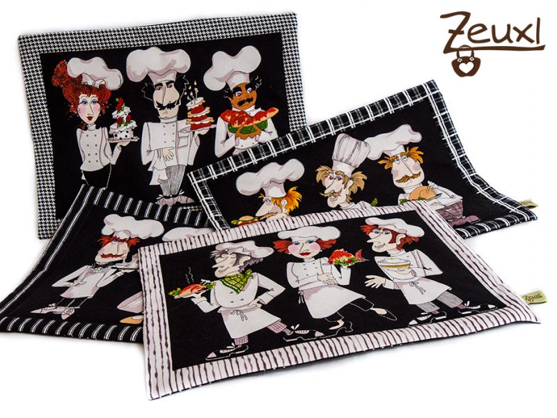 Aber zurück zum Brotkorb: Auf der Suche nach Stoff dafür bin ich über diese lustigen Köche gestolpert. Was für ein positiver Nebeneffekt, dass neben dem Streifen für den Brotkorb noch vier Platzsets „abgefallen“ sind. So habe ich als Kombinationsstoffe einen Schwarz-Weiß gestreiften und einen schwarzen Stoff mit weißen Punkten besorgt. So bekamen die Sets eine passende Rückseite und der Brotkorb eine ausreichende Höhe, bzw. passenden Innenstoff.