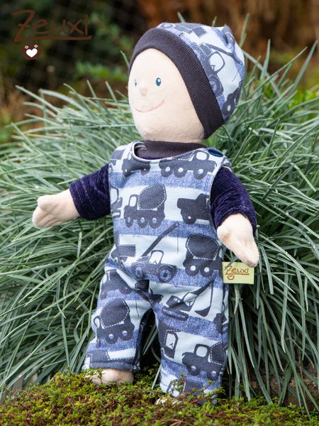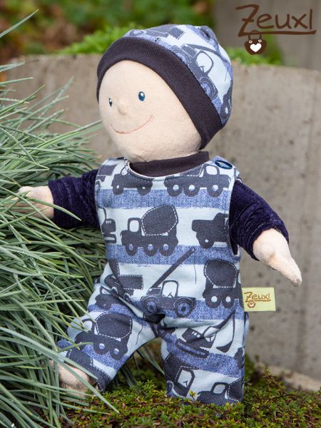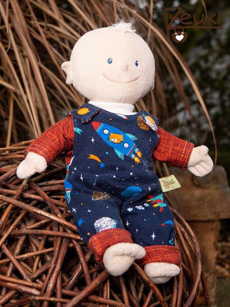 Ich persönlich kann sagen, den Schnitt vom Strampler finde ich am schönsten. Den habe ich einmal passend zum Shirt des Buben, aus dem Raketenstoff genäht. Hier mit einem roten Shirt kombiniert. Im Partnerlook mit Tunichtgut zu sein, findet unser Bub echt witzig. Überhaupt ist er sehr stolz auf die neue Kleidung der Puppe. Jeder Gast darf/muss erstmal die neue Kollektion würdigen ;-)