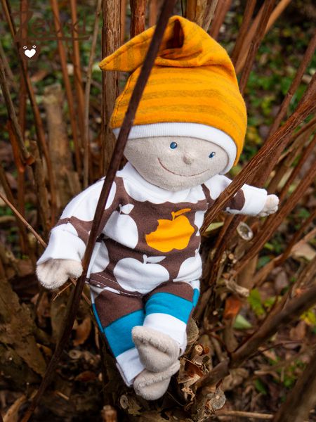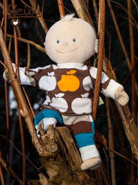 Dann kam passender weise der Probenähaufruf vom Dorfzwerg und den Stoffrettern. Es sollten Puppenkleider speziell für Krümel und Krümelchen getestet werden. Eine super Gelegenheit und ich wurde auch tatsächlich mit ausgewählt. Hose, Shirt, Mütze, die Grundkleidung sozusagen. Recht einfach zu nähende Schnitte (wenn man in dieser Minigröße mal von einfach sprechen möchte) alle mit dem Zusatz „Faulenzer“ und dann einige, etwas aufwendigere Teile, die mit „Streber“ gekennzeichnet sind. Endstanden ist beispielsweise ein ein Set aus diesem Äpfelstoff von Mamasliebchen. Die Zipfelmütze, für die es natürlich auch ein Schnittmuster gibt, passt einmal hierzu und auch zu einem weiteren Set.