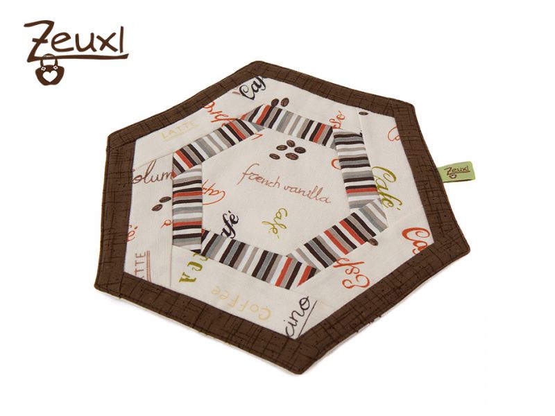 Da die Beschenkte gerne und viel Kaffee trinkt, passt dieser Stoff für sie ganz gut. Der Untersetzer könnte in der Küche auf dem Esstisch genauso seinen Platz finden, wie auch auf dem Fensterbrett oder im Regal.