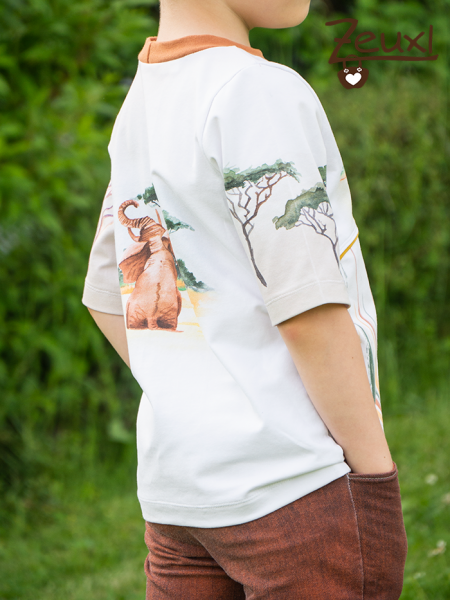 Erst war ich nicht sicher ob der Stoff dem Buben gefallen würde. Inzwischen frage ich nämlich lieber vor der Stoffbestellung nach. Diesmal musste ich mich jedoch schnell entscheiden, denn das Stoffpanel ist keine Lagerware oder Vorbestellung. Er stammt aus einer Sewprisebag, die weiterverkauft wurde. Da konnte ich nicht lange überlegen. Aber glücklicherweise findet er sein Afrikashirt gut und trägt es total gerne.
