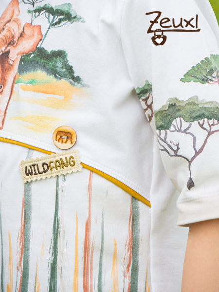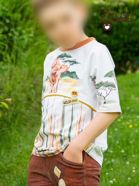 Eines meiner Lieblingsshirts unsers Buben ist dieses Jahr auf jeden Fall das mit dem Elefanten. Das Design und die Farben sind so, so schön. Die Savanne, die Akazienbäume und auch der Elefant. Nicht cool, nicht gefährlich, nicht gruselig, einfach nur schön!