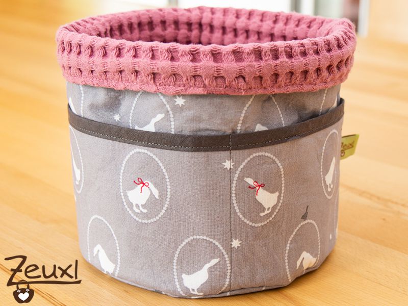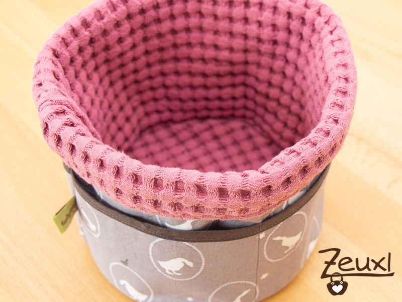 Damit der etwas festere Waffelstoff genügend Stütze erhält, habe ich den Außenstoff des Utensilos mit 250er Bügeleinlage verstärkt. Da eins der Babys, die beide im Sommer zur Welt kommen, vermutlich ein Mädchen sein wird, entschied ich mich mal etwas „mädchenfarbiger“ zu nähen. Der Waffelstoff in altrosa gefiel mir ganz gut und dazu kombinierte ich diese süßen Gänse auf grauen Hintergrund. So wird das Ganze auch nicht zu rosa.