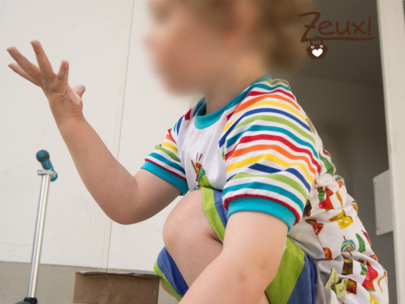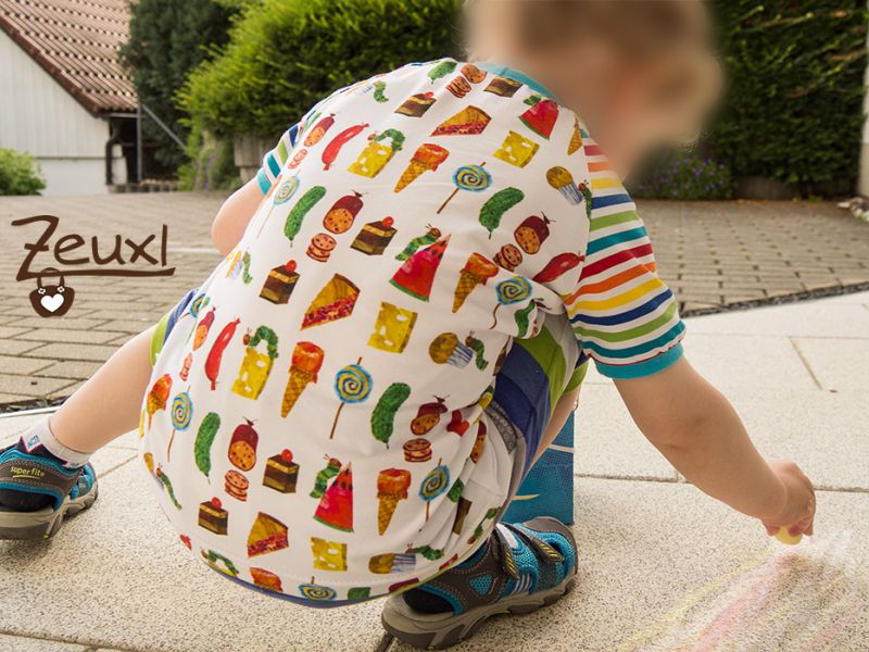 Der Lolli passte einfach prima vorne auf das Shirt und die anderen Essenssachen hinten drauf. Nun „muss“ der Bub, bevor er das T-Shirt angezogen bekommen kann, immer erst die Rückseite studieren, da er diese im getragenen Zustand selbst ja leider nicht zu sehen bekommt.