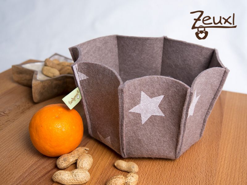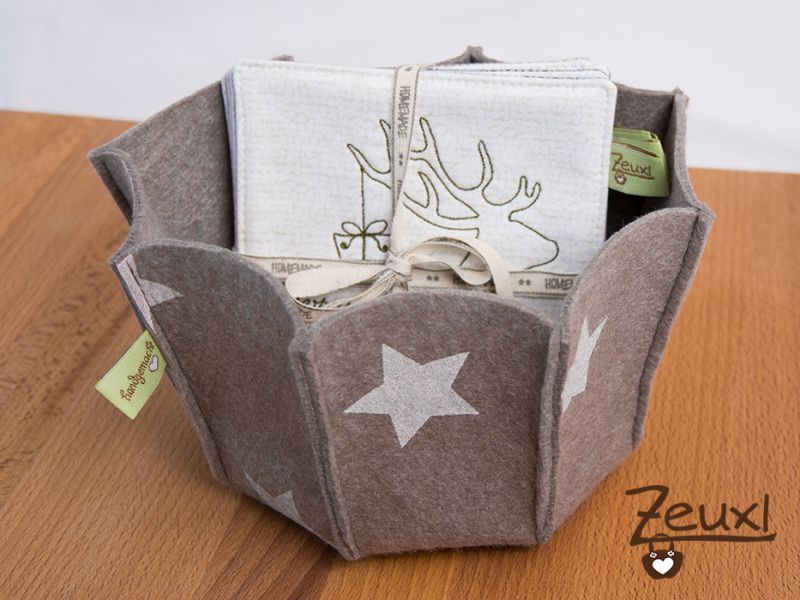 Ich wollte, dass die Körbchen auch einen Nutzwert bieten und habe deshalb eine größere Größe genäht. Da dadurch der Filzverbrauch höher ist musste ich nachordern. So sind verschieden farbige Körbchen, mit und auch ohne Sternaufdruck, entstanden.