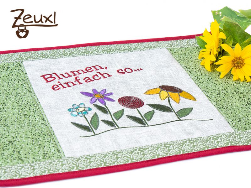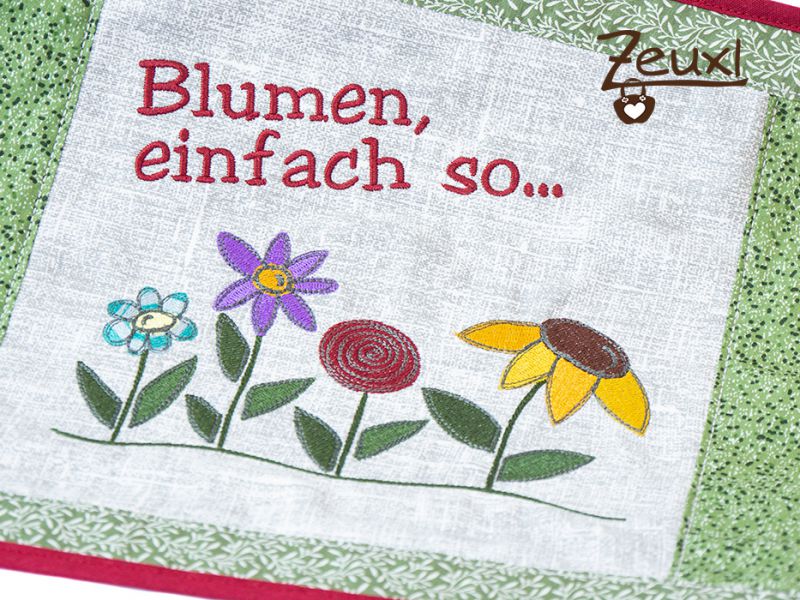 Die Stickdatei durfte ich im Rahmen eines Probestickens für Fadenspiel - Handmade by NB als Vollstick testen. Nachdem ich die Blumenwiese Doodle Datei für diesen Leseknochen verwendete entschied ich mich beim Vollstick dafür, daraus ein Tischset/Untersetzer zu nähen. Die Blumen lassen sich super als zusammenhängende Blumenwiese sticken, aber auch einzeln machen sie eine gute Figur. Leider habe ich im Moment zu wenig Zeit zur Verfügung all meine Ideen umzusetzen.