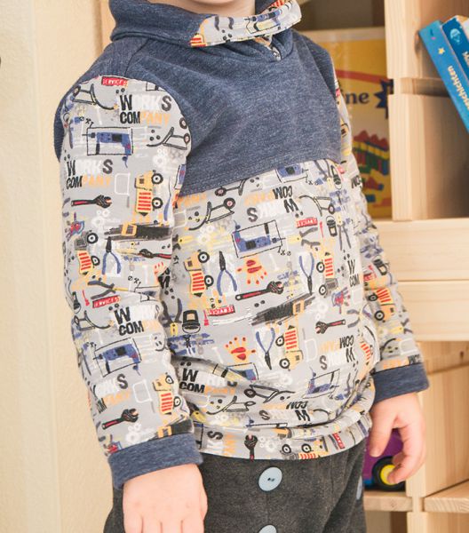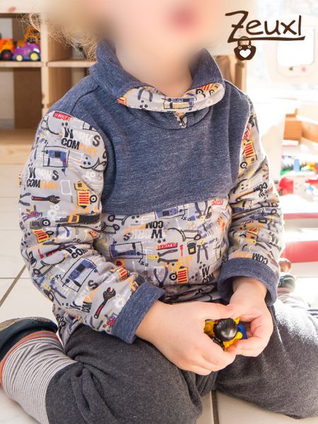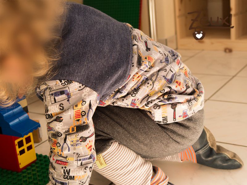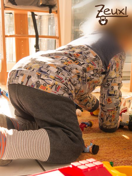 Unter anderem hatte ich den Schnitt Flo von Rockerbuben neu gekauft, da dieser einen etwas enger anliegenden Halsausschnitt mit Kragen hat und keine Kapuze, die unser Junior ja nicht so gerne mag. Der Kragen hat schon etwas von Rollkragen und hält so den Hals warm genug. Allerdings müssen wir beim An- bzw Ausziehen schon einbissl "ziehen" um den kleinen Dickschädel durch zu bekommen.