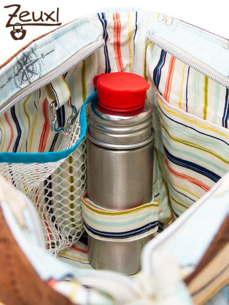 Auf der anderen Seite befindet sich ein Einsteckfach mit Druckknopf. Und damit eine Getränke- oder Babytrinkflasche in der Wickeltasche sicher transportiert werden kann entschied ich mich für eine Klettlösung als flexible Befestigung.