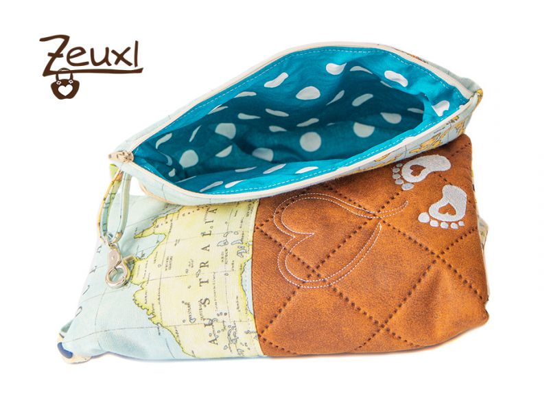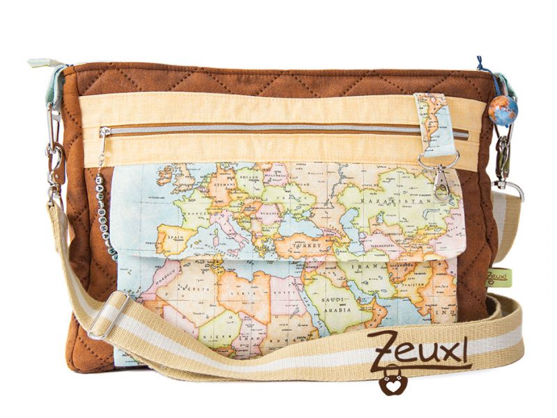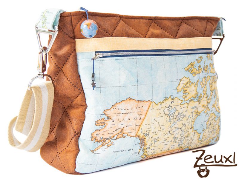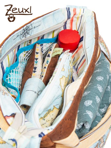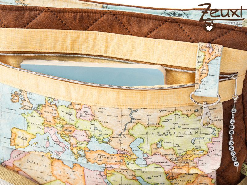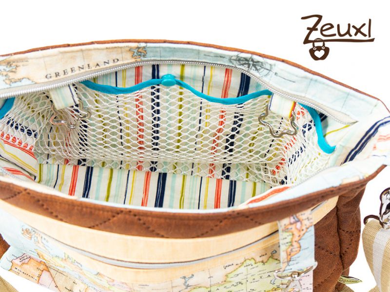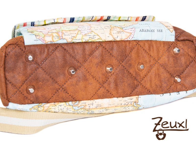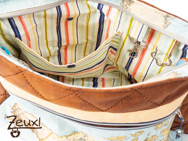 Die Stoffwahl fiel auf den tollen Landkartenstoff in Kombination mit einem lederartigen Steppstoff. Für das Futter entschied ich mich für einen bunt gestreiften Stoff, den die Besitzerin mag es gerne farbig. Eigentlich wollte sie die Tasche innen gerne abwischbar haben. Aber ich war mir etwas unsicher, ob das eine gute Idee ist, denn innen waren (wenn auch wenige) Fächer eingeplant und ich wusste nicht, ob das beschichtete Material dann der Belastung standhalten würde.