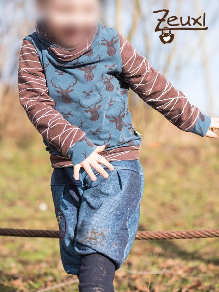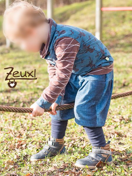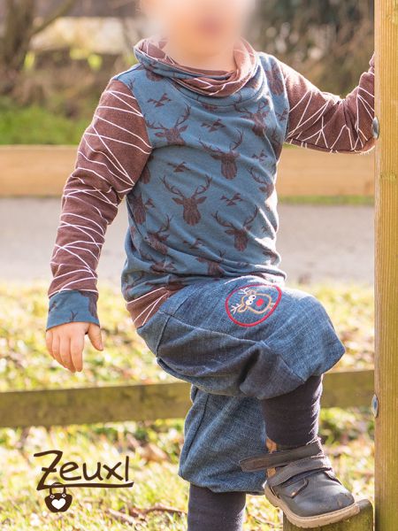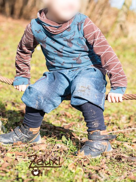 Für die Hose verwendete ich den Byxa Tulipan Hosenschnitt von Tidöblomma. Ganz ohne Taschen dieses Mal. Dieser dicke Sweat im Jeans-used-look eignet sich prima für eine warme Hose. Besonders gut an diesem Schnitt finde ich die große Bewegungsfreiheit. Kinder sollen, ja müssen sich super bewegen können und trotzdem „gut“ verpackt sein.