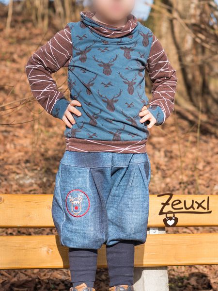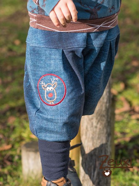 Es gab also kein Weihnachtsteil, aber für die kalte Jahreszeit sind für den Buben einige warme Oberteile und Hosen entstanden. Unter anderen eine kuschelige Winterhose mit Elchstickerei, die für den Buben eindeutig ein Hirsch ist. Dazu noch ein passender Hirschpulli und fertig ist das Winter-Set.