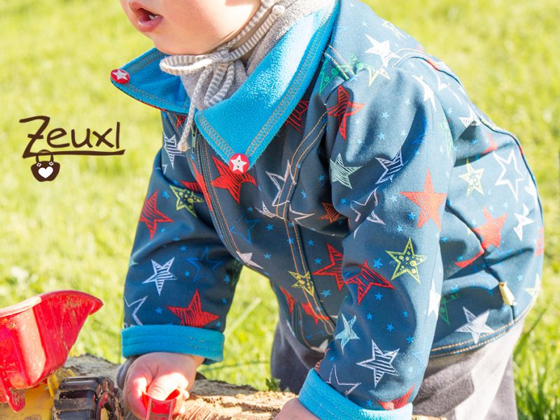 Die Jacke mit Reißverschluss sollte eigentlich laut Beschreibung eine Kapuze bekommen. Ich wollte aber lieber einen Kragen. Es wird in der Anleitung auch eine Weste mit Kragen beschrieben, die ist allerdings gefüttert. Da der Softshell innen schon schön kuschelig ist habe ich auf das Futter verzichtet. Die Folge war, dass ich Mühe hatte, das Reißverschlussende am Kragen zu „verstecken“. Denn in der Anleitung wird das mit der Kapuze gelöst. Meine Näherfahrungen halten sich ja noch in Grenzen und so muss ich zugeben, habe ich an dieser Stelle keine wirklich elegante Lösung gefunden… Außerdem sind die beiden Knöpfe am Kragen dazu da, die - formulieren wir es mal positiv – wenig perfekten Covernahtenden zu verzieren ;-)