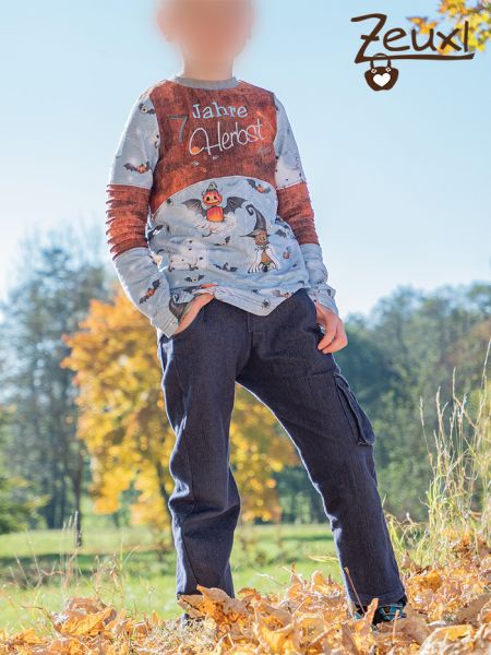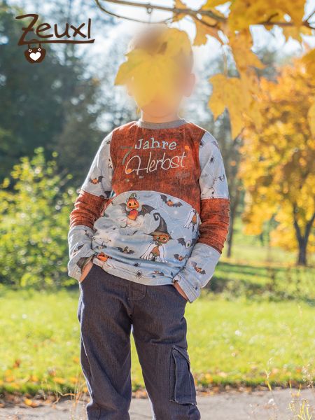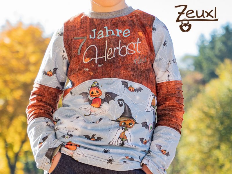 Meistens kann ich ohne Vorgaben losnähen. Ich suche den Schnitt aus und im Grunde ist es auch klar, welche Stoffe in Frage kommen. Manchmal frage ich kurz nach, ob die Motive noch gefallen. Denn in der Regel liegen die Stoffe eine Weile bis sie bei mir unter die Nadel kommen und da kann sich der Geschmack beim Buben schon mal ändern. Hier war das kein Problem, denn die Halloween-Stoffe hatten wir erst kürzlich bestellt und aus einem sollte das Geburtstagsshirt werden.