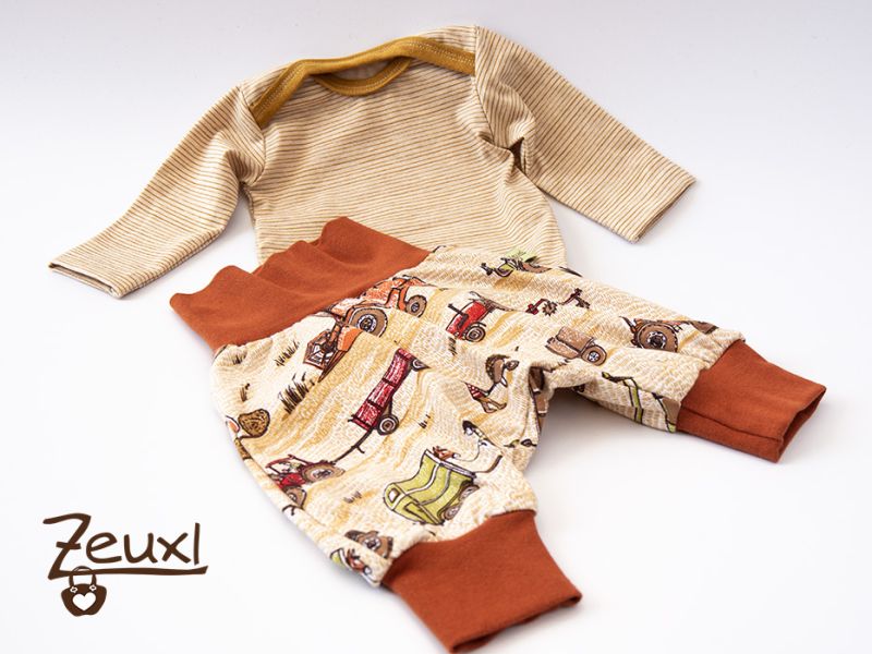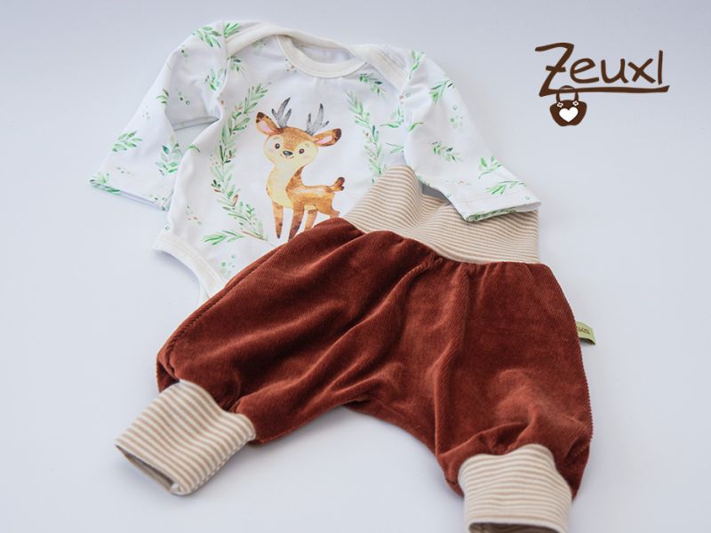 Zur Tasche bekam sie noch eine Kuscheldecke (gekauft) und etwas Kleidung für das Baby. Checkerhosen von Klimperklein und Regenbogenbodys von Schnabelina. Die Sachen sind auch noch gut für ein zweites Baby tragbar und werden hoffentlich genauso, wie die Tasche, immer noch gerne genutzt.