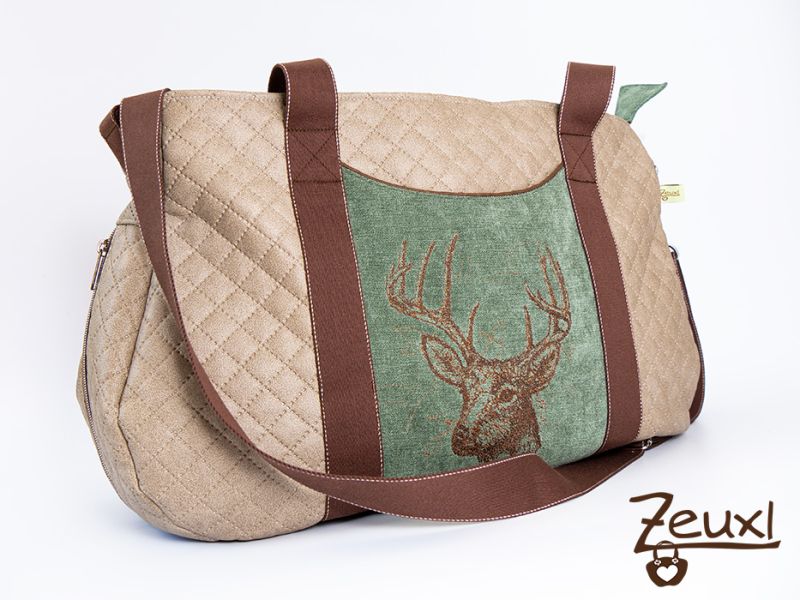 Ich wählte ein gestepptes Kunstleder, so kann die Tasche größtenteils mit einem feuchten Lappen gereinigt werden und als Kombi nutze ich grünen Möbelstoff und braunes Gurtband. Den grünen Stoff bestickte ich auf der einen Seite mit diesem wunderschönen Hirsch von Cyncopia, hinter dem sich ein Steckfach befindet, und auf der anderen Seite, wo ein Reißverschlussfach zu finden ist, sind Rehe aus einem Set von Rock Queen zu sehen.